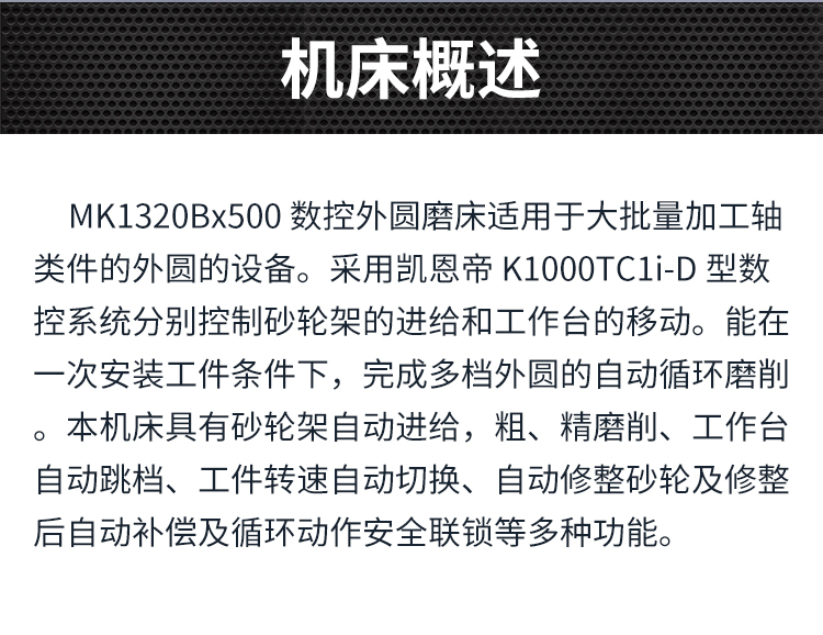 本机床具有砂轮架自动进给,粗、精磨削、工作台自动跳档、工件转速自动切换、自动修整砂轮及修整后自动补偿及循环动作安全联锁等多种功能。
